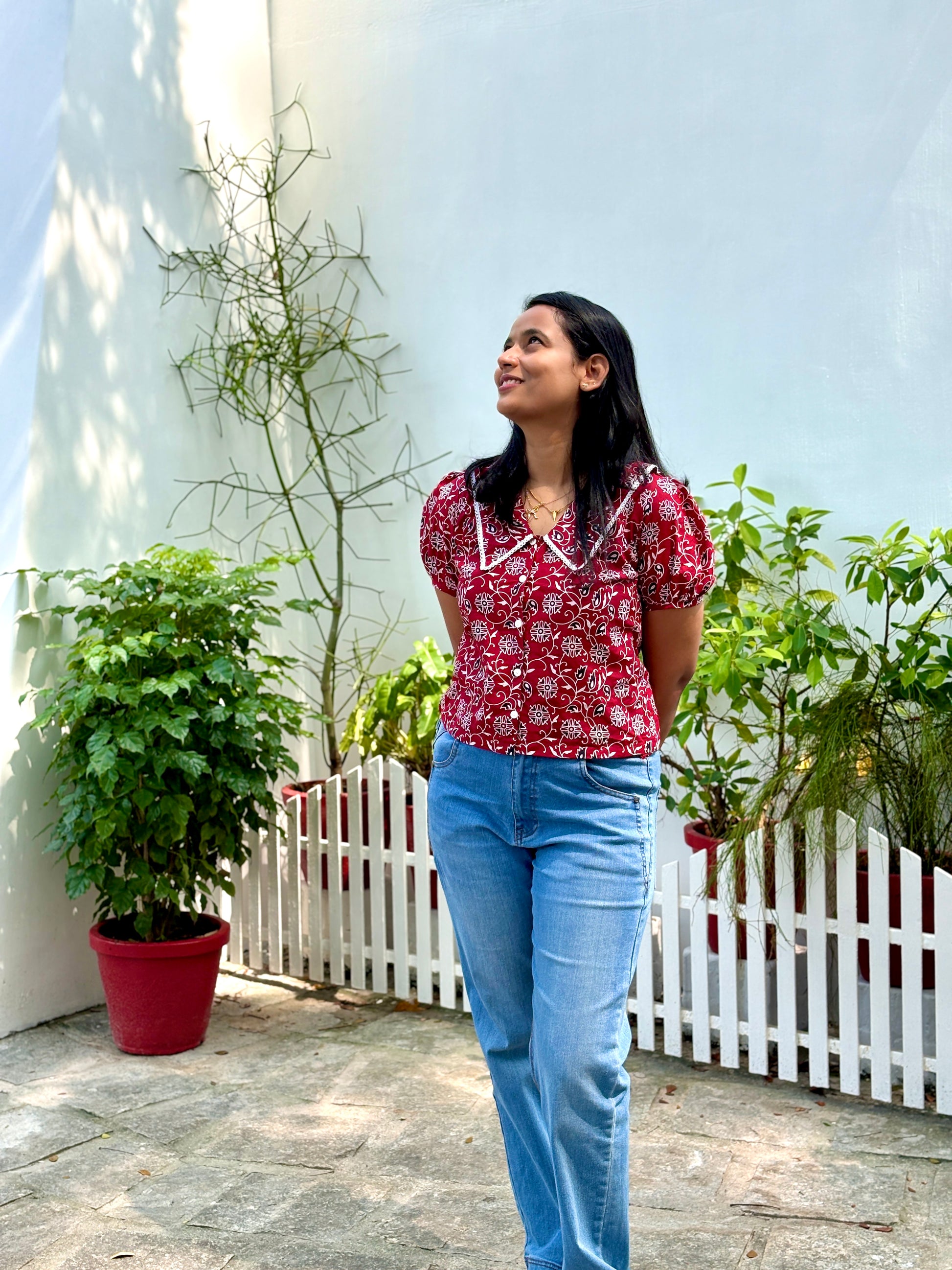 Celebrate Christmas in timeless elegance with our beautifully crafted Christmas Button-Down Top. Designed with a festive deep red base and delicate white holiday-inspired floral motifs, this top blends classic charm with cozy chic. The Peter Pan collar with contrast edging, soft puff sleeves, and a classic button-down front create a feminine, stylish silhouette. Made from 100% breathable cotton, it’s perfect for warm tropical Christmas days and effortlessly elevates your holiday look.